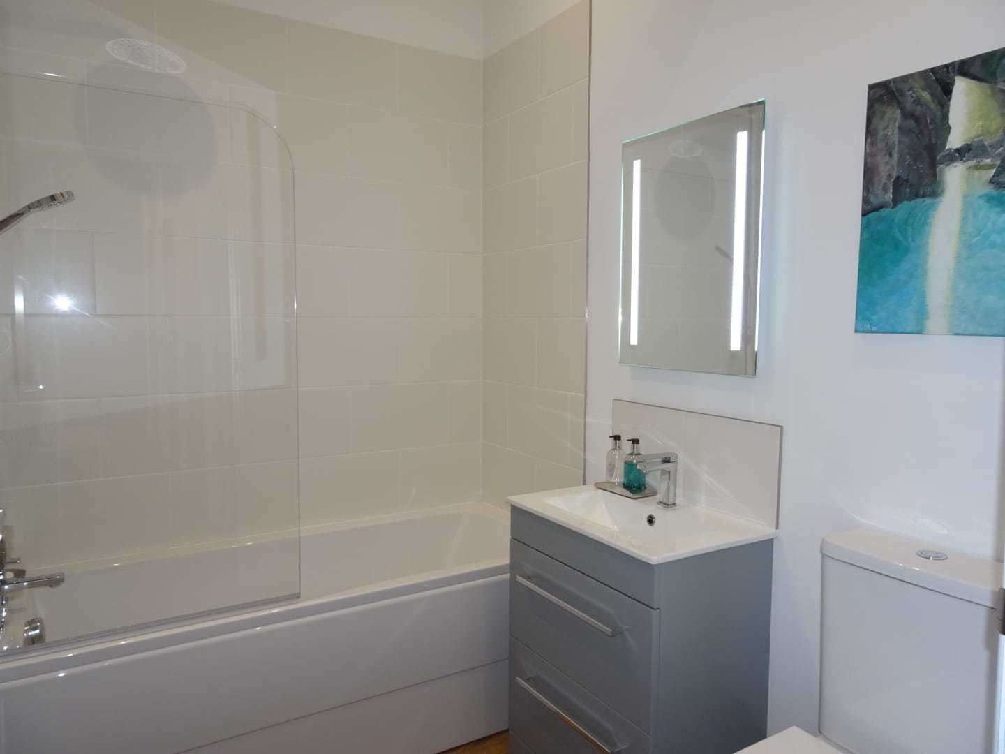 Bath with mixer tap, with both rainfall and handheld shower over, shower screen, heated towel rail, demisting mirror with light, close coupled WC, basin with built in drawer unit under and partially tiled walls.