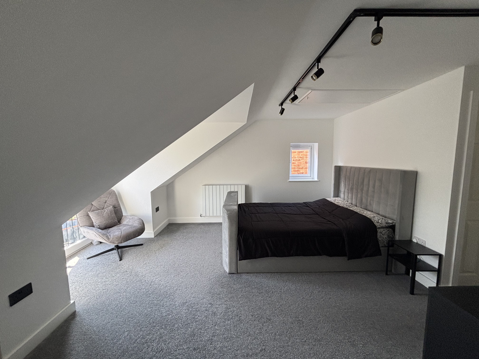 The top floor provides two further bedrooms, including a spacious principal bedroom with Juliet balcony and a private en-suite shower room. A pull-down ladder leads to a boarded loft space providing valuable additional storage. Bedroom two benefits from dormer and Velux windows, allowing plenty of natural light.