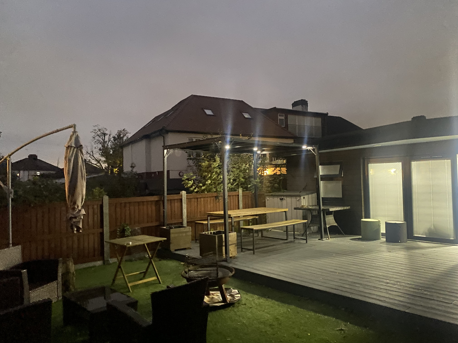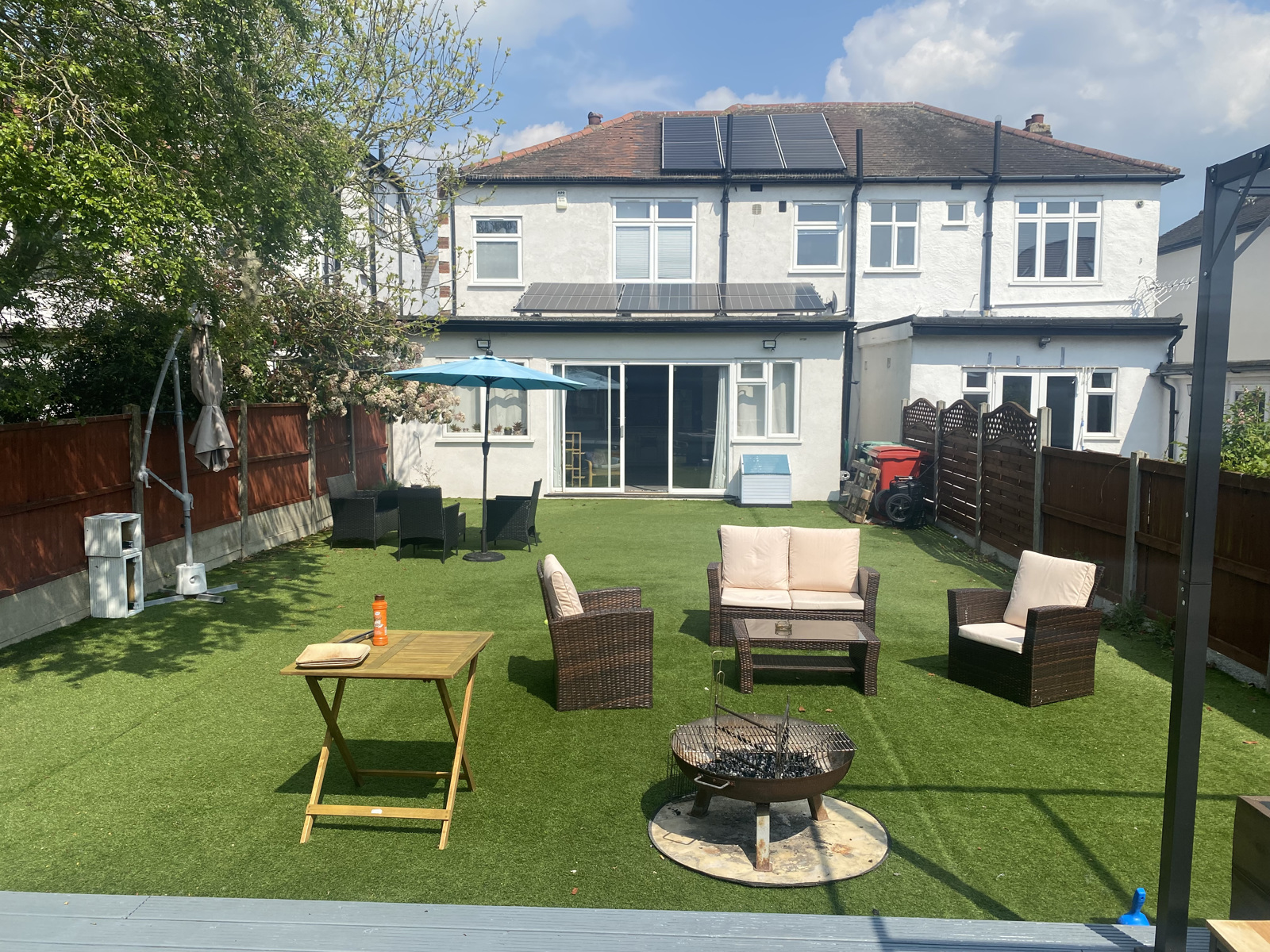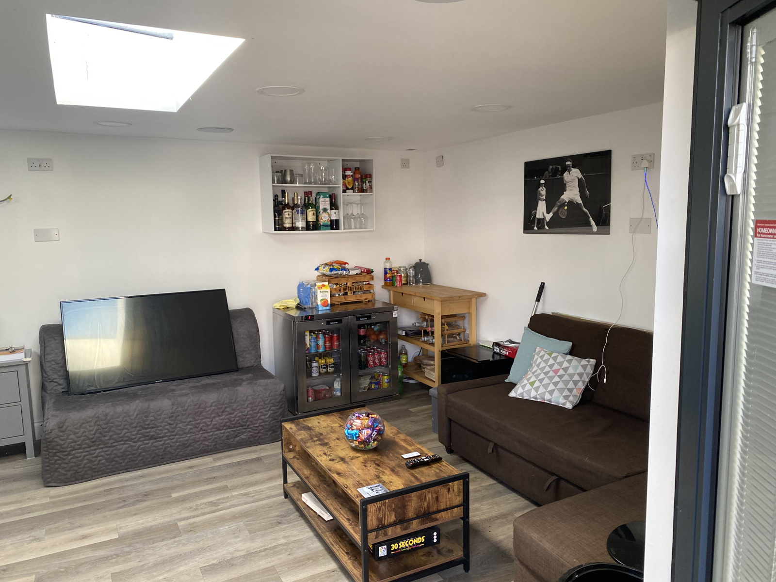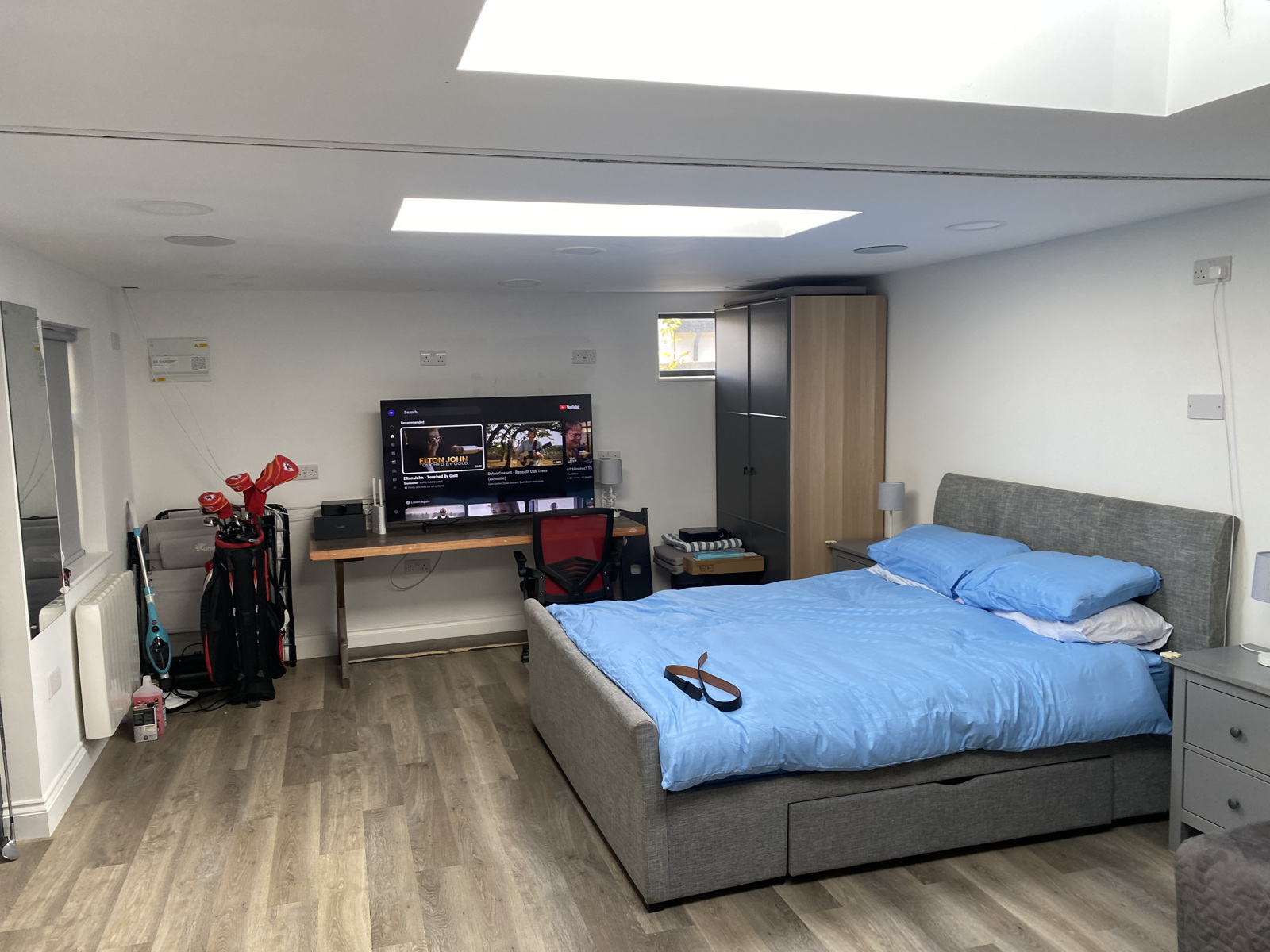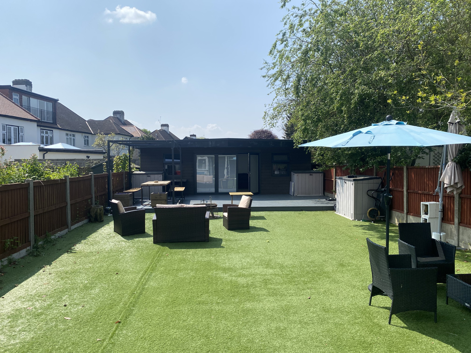 Externally, the property continues to impress with a low-maintenance landscaped rear garden, featuring artificial grass and a decking area ideal for outdoor entertaining. A standout feature is the large garden room (approximately 40 sqm) with bi-fold doors, offering a versatile space perfect for a home office, gym, studio, or entertainment area.