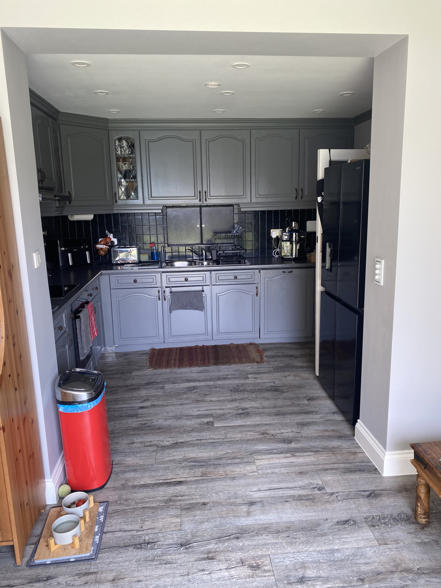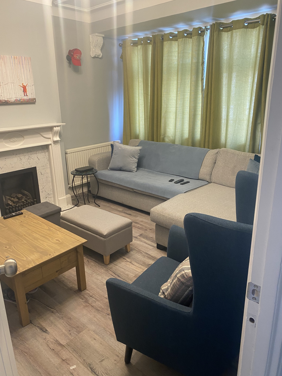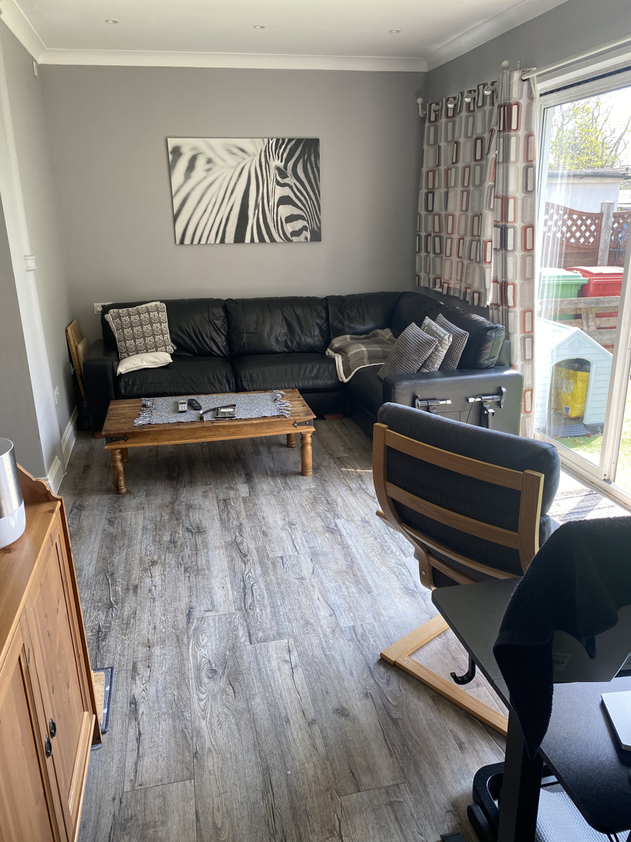 The ground floor comprises two spacious reception rooms, creating flexible living and entertaining spaces. The principal living room features a stylish gas fireplace and durable Mountain Oak Moduleo flooring, while the second reception room benefits from sliding doors opening directly onto the south-facing rear garden, allowing natural light to flood the space throughout the day.