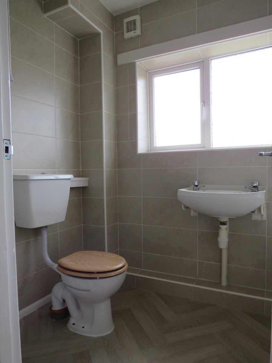 White three piece suite comprising panelled bath with electric shower, pedestal wash hand basin, low level WC, extractor fan, fully tiled walls, radiator and double glazed window to rear.