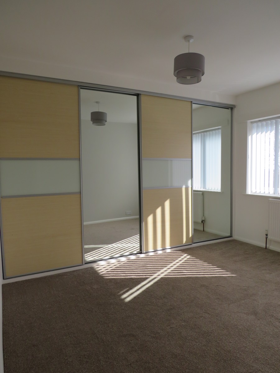 Double glazed window with large mirrored sliding fitted wardrobes and radiator.