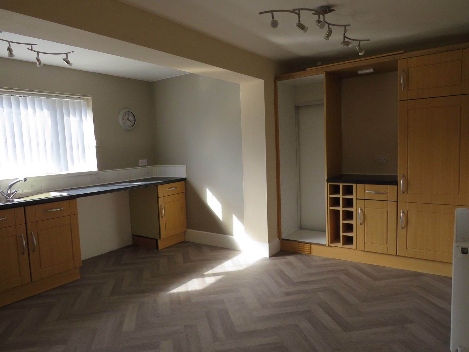Good range of base and wall units finished with coordinated work surfaces, sink unit, extractor hood, electric cooker, fridge freezer, space for washing machine, partially tiled walls, radiator, large space for dining table with chairs and double glazed window to rear looking out to large rear garden.