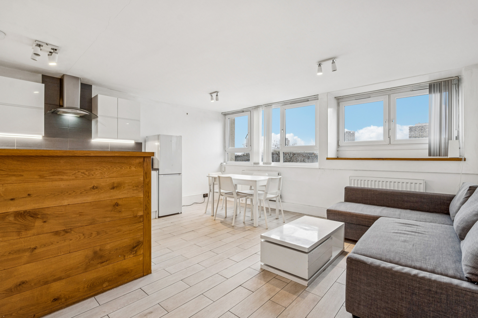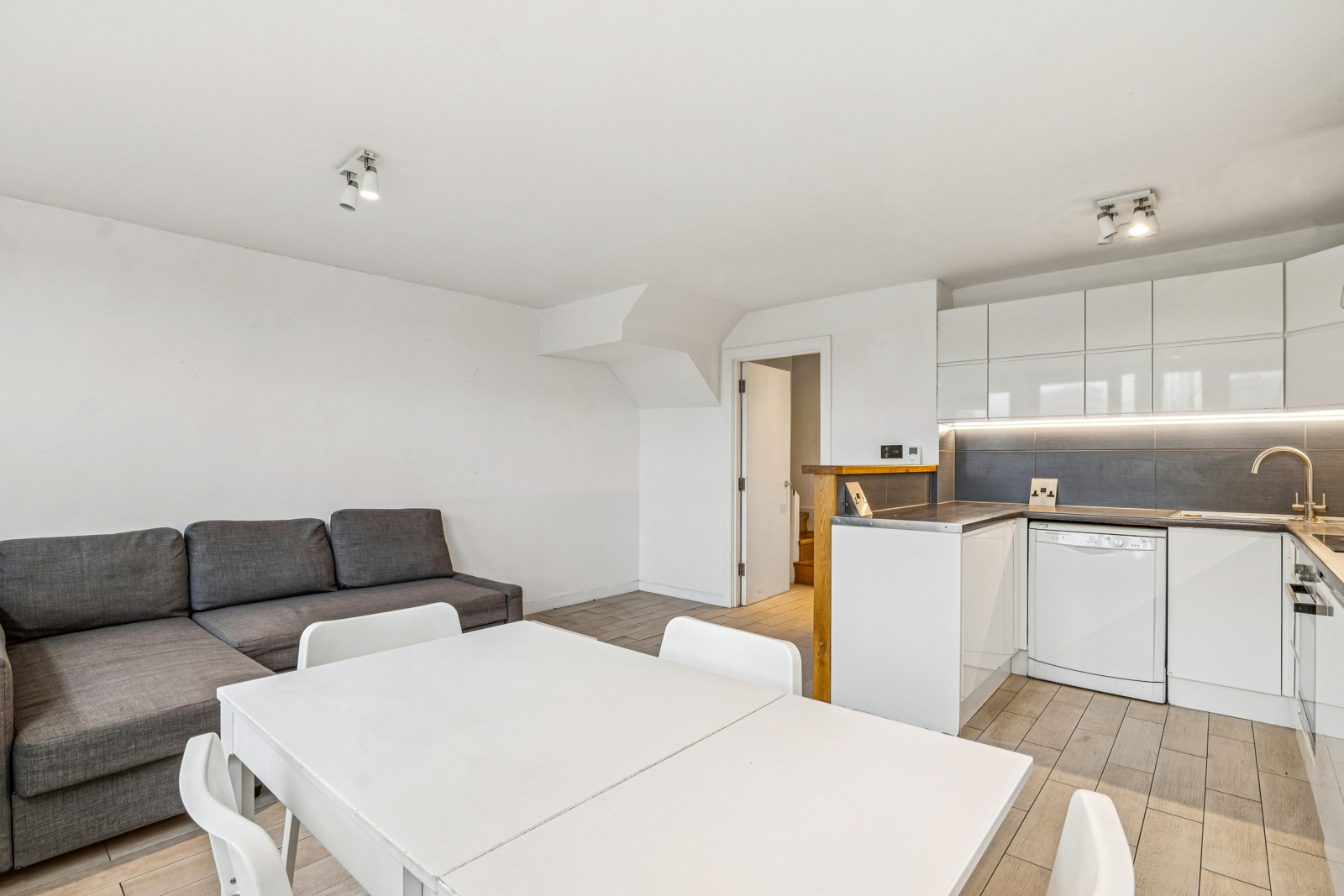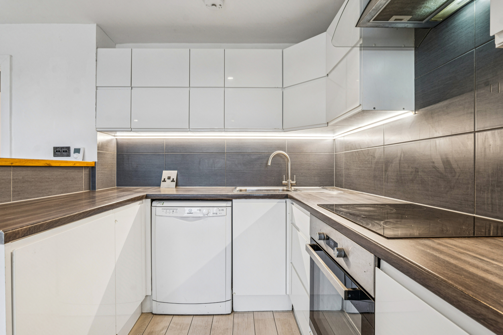 The open plan living kitchen area is modern and bright, with a white gloss finish kitchen and wooden flooring which runs throughout the flat.