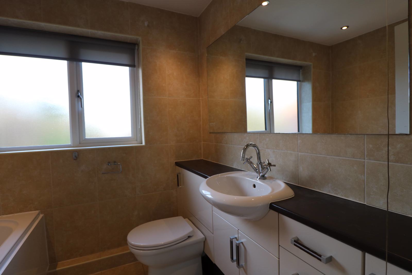 Modesty double glazed window. Low level W.C. Wash hand basin set in vanity unit.