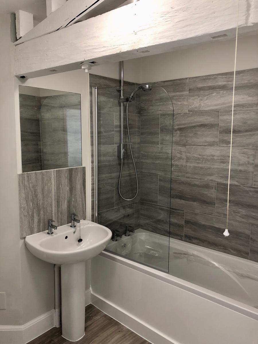 This two bedroom, 3rd floor flat has a lovely feel, it is spread over two levels, with a large entrance hall/lobby with a few steps that lead up to the living area. It is light thanks to its aspect and also a very large velux window in the ceiling to proved natural light to the hallway. The living accommodation is comprised of one master bedroom suitable for a double bed, and one smaller room suitable for a single bed. The bathroom features a shower over a bath. The kitchen living area is open plan with windows that look towards the harbour. The kitchen was recently installed and comes complete with fitted oven and hob.