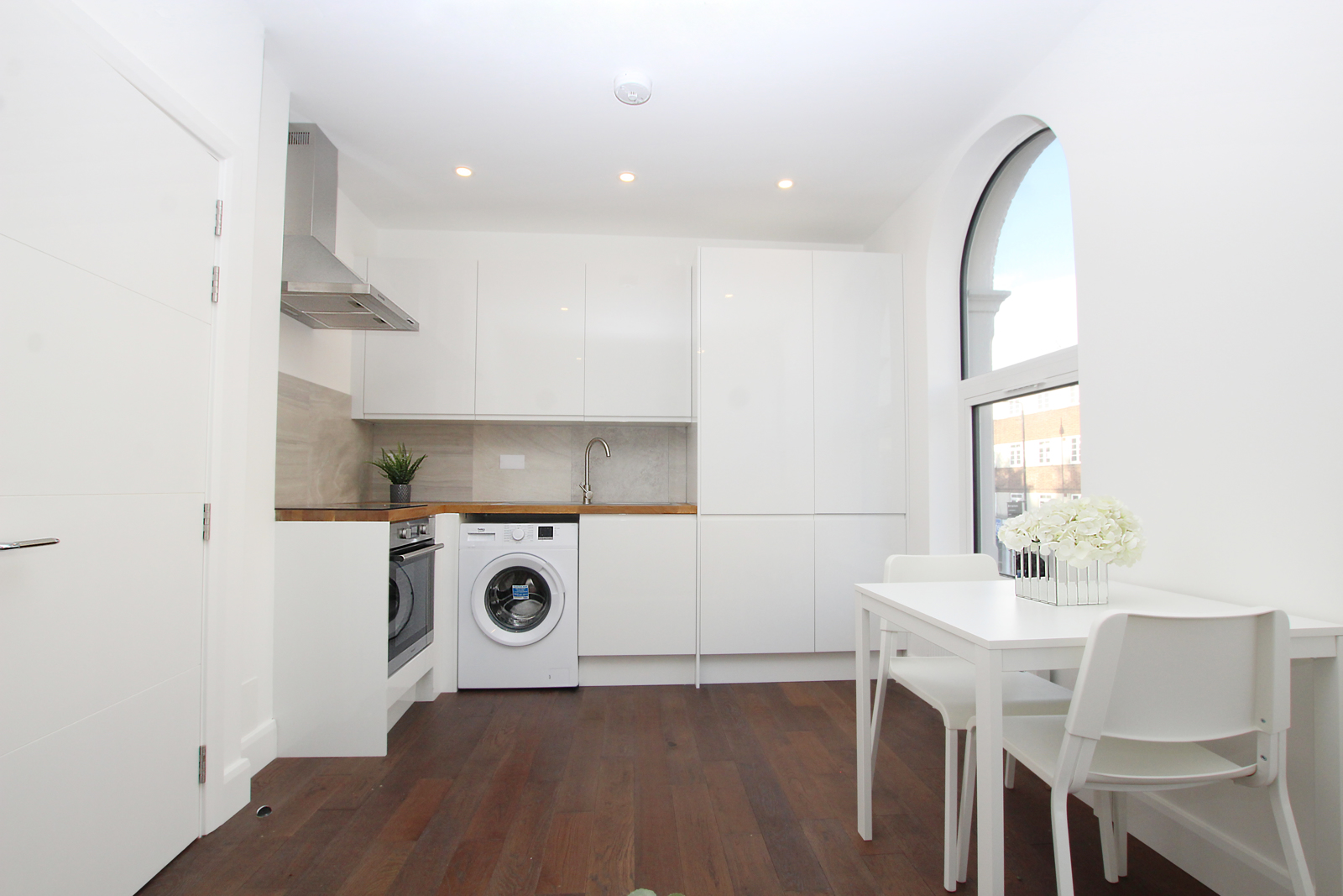 All appliances are integrated and the flat has a contemporary feel to it, with dark wood flooring running throughout the living space.