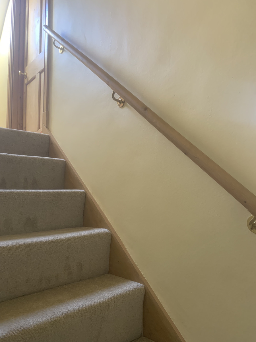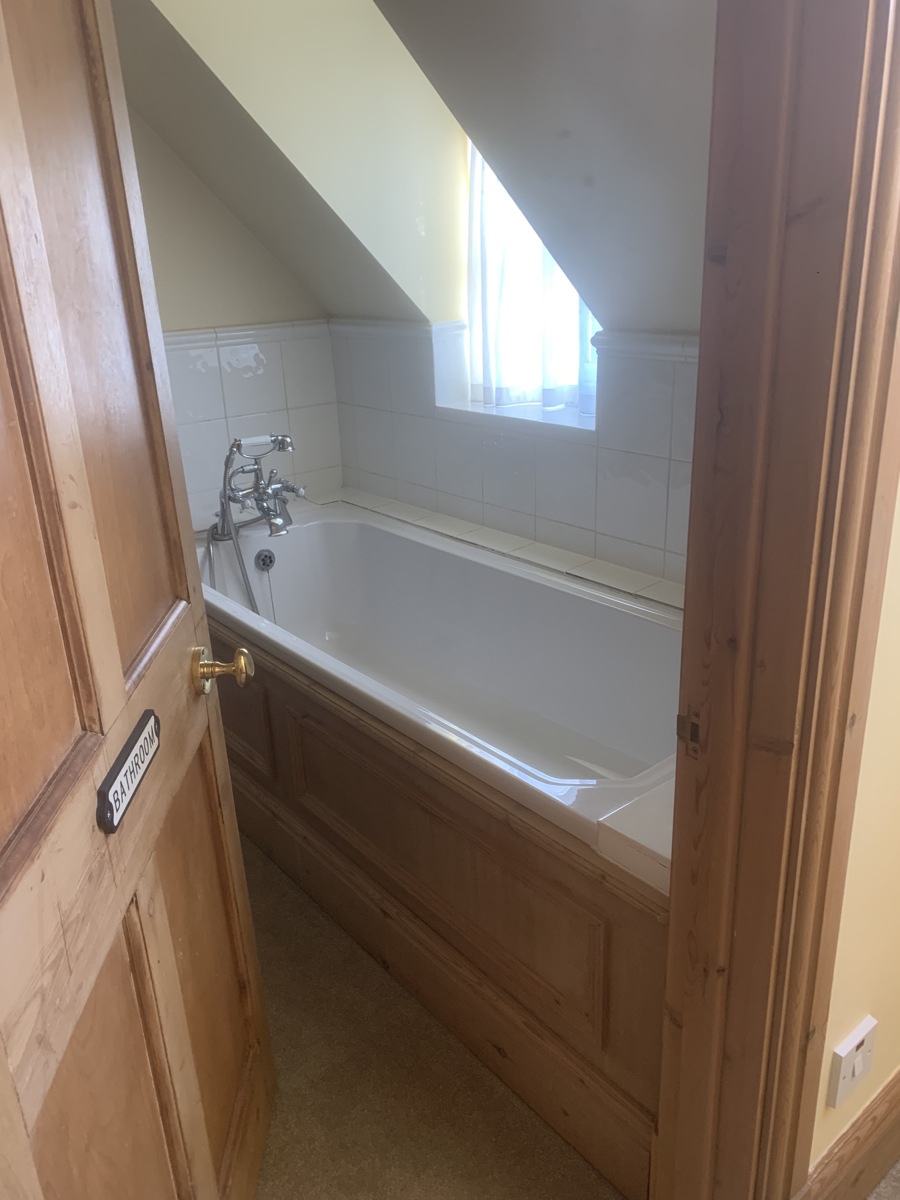 The stairs off the kitchen take you up to the sizeable master bedroom one side (with built in wardrobe) and bathroom to the left side, with bath tub and separate airing cupboard.