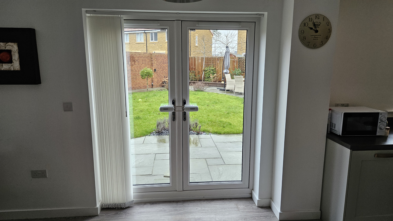 Open plan kitchen/dining/family room with french doors to the garden