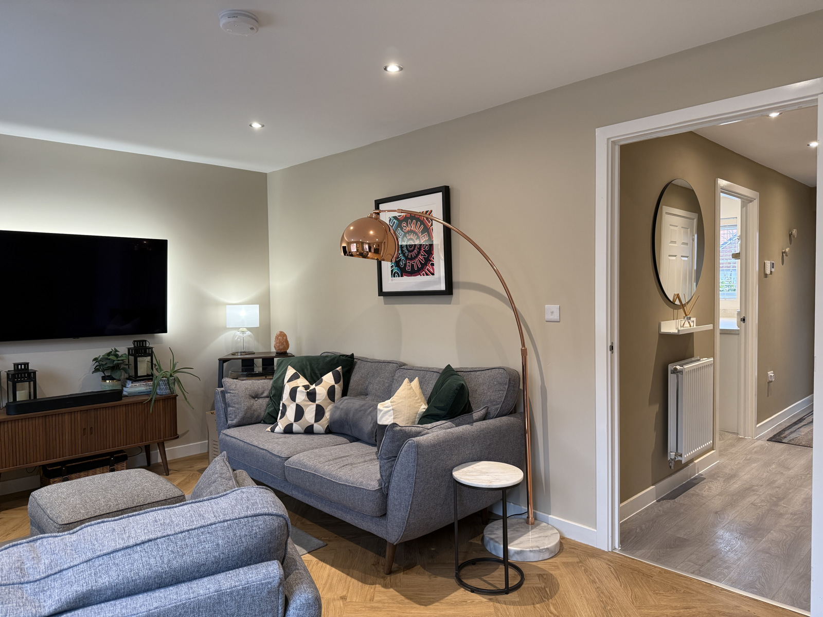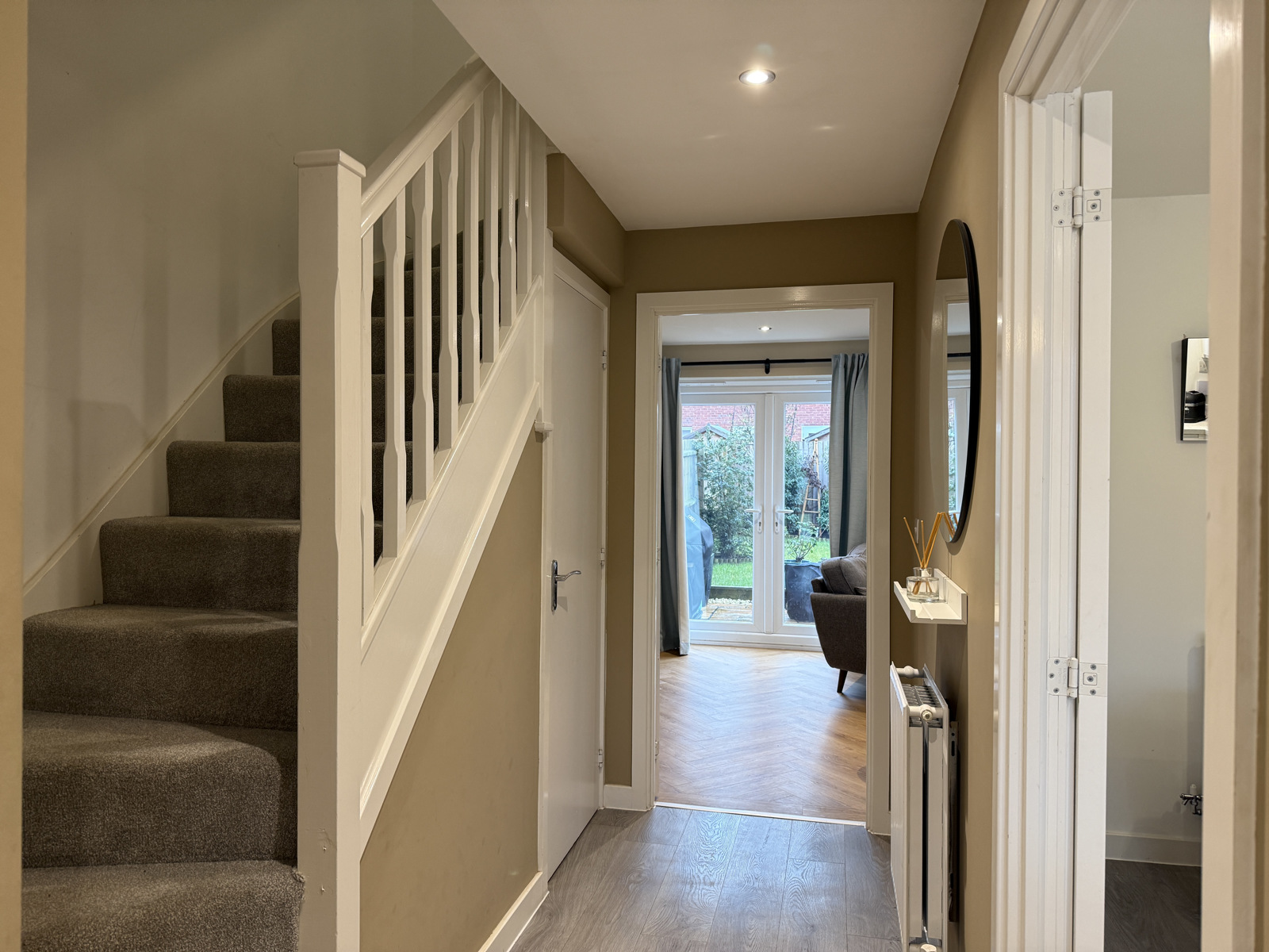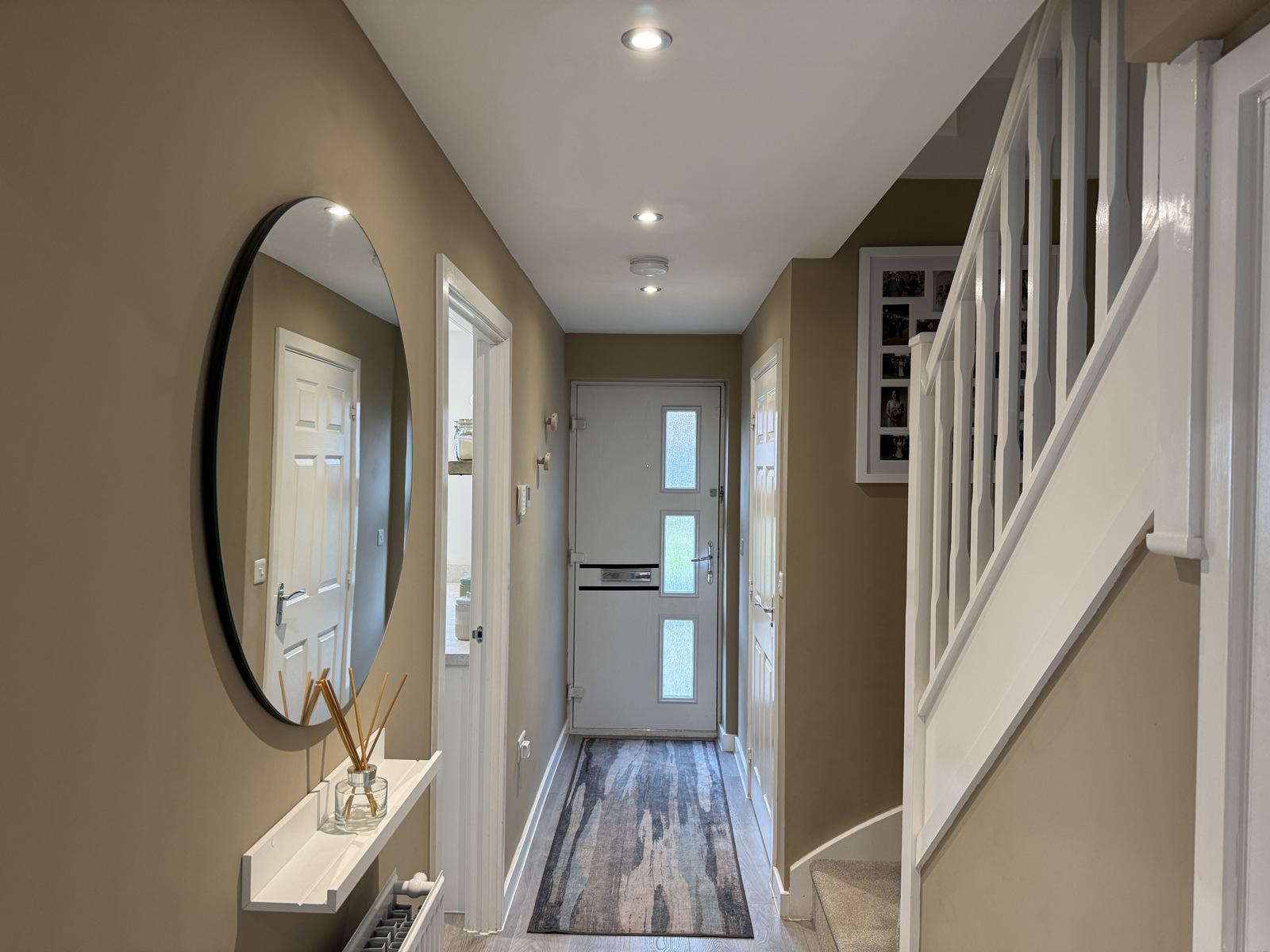 With understairs cupboard and doors off to the kitchen, lounge;