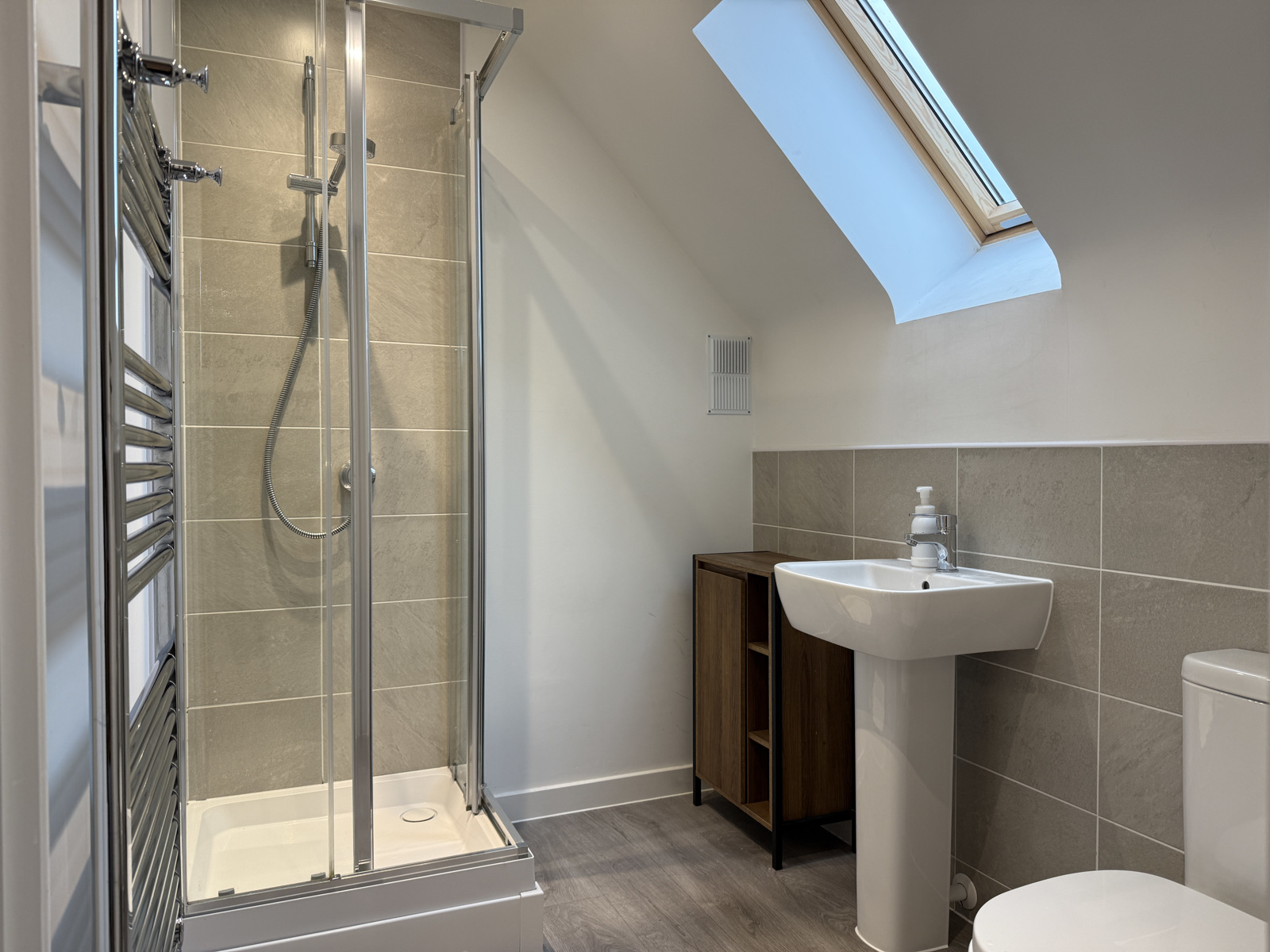 Partly tiled En Suite having double glazed sky light window, wash hand basin, shower cubicle with Mira thermostatic shower, WC and radiator: