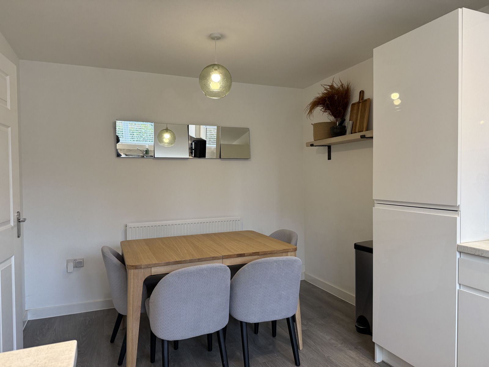 Modern fully fitted kitchen with integrated electric fan oven, hob, dishwasher, washing machine, and fridge/freezer. Double glazed window overlooking front garden. Dining area with space for table and chairs.