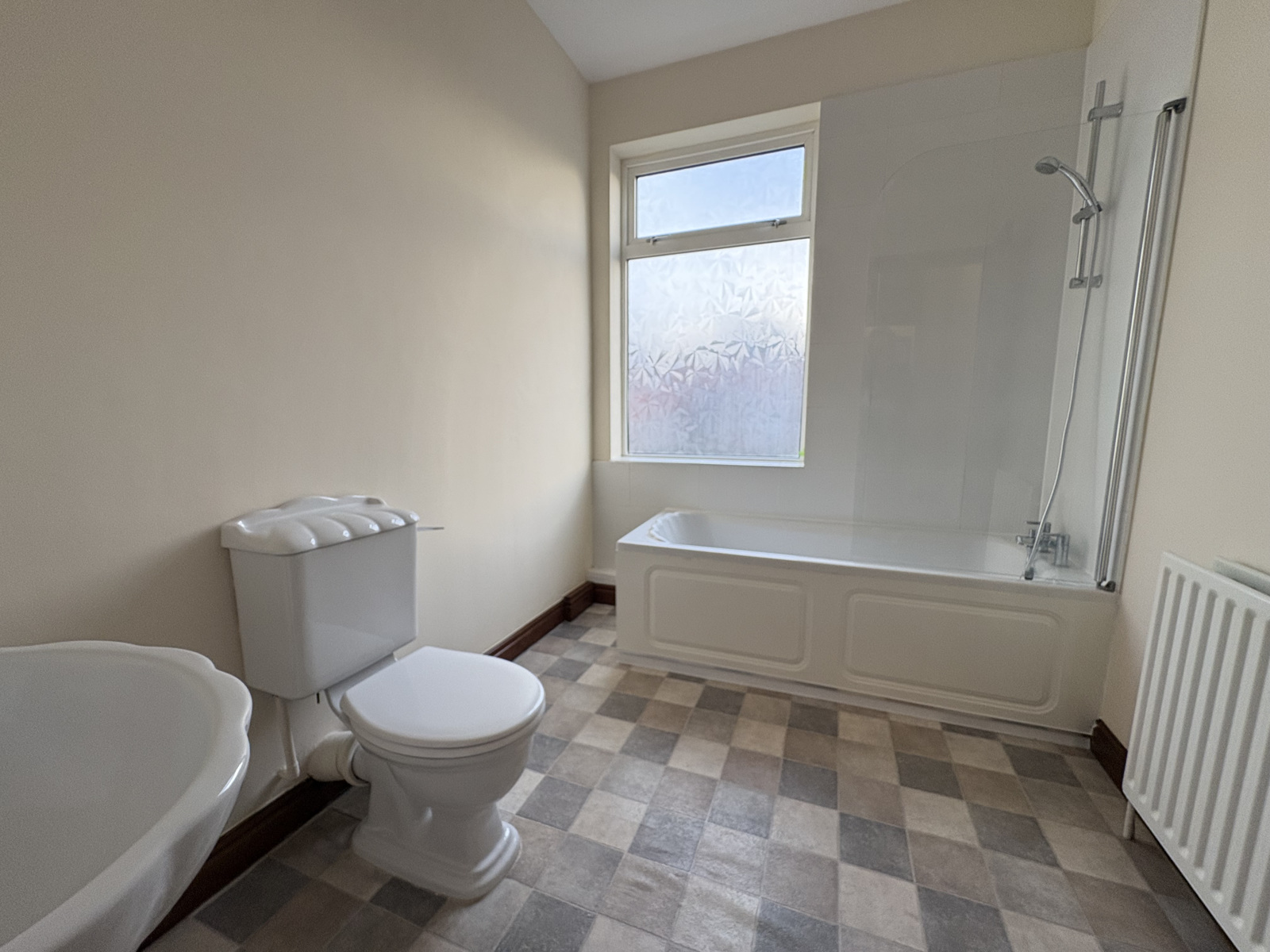 * The large modern family bathroom has a bath with a shower over.