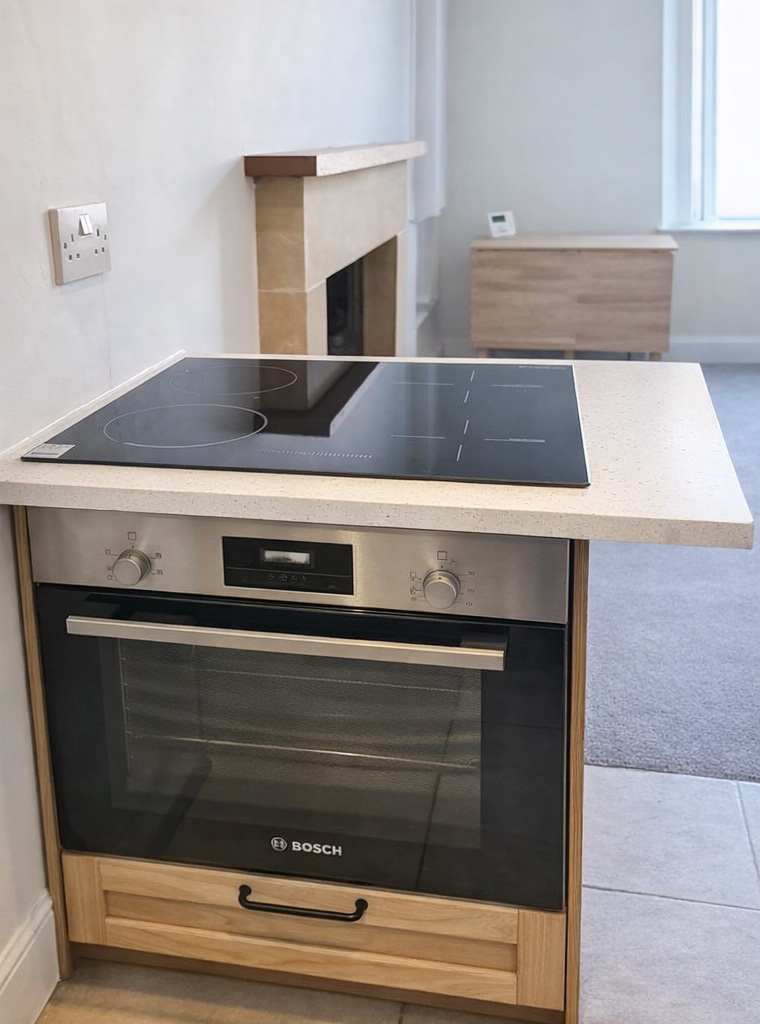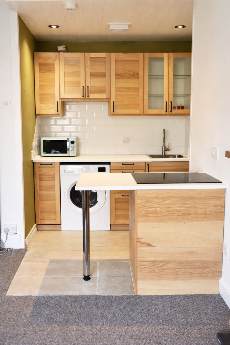 Flat has good-sized rooms and large walk-in closet in the bedroom for further storage. It comes part-furnished with basics such as bed, couch, bedroom furniture, large refrigerator/freezer. The following are new in the flat: new paint, windows, carpets and furniture. It's a gorgeous, sunny place. The cooking is opposite the sink and microwave. It is electric hob and fan assisted electric oven.
