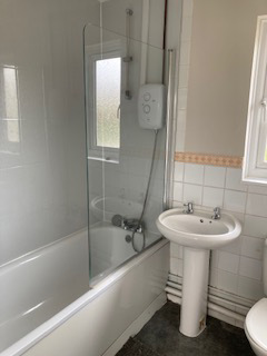 Main bathroom with bath and shower over, w.c. wash hand pedestal.