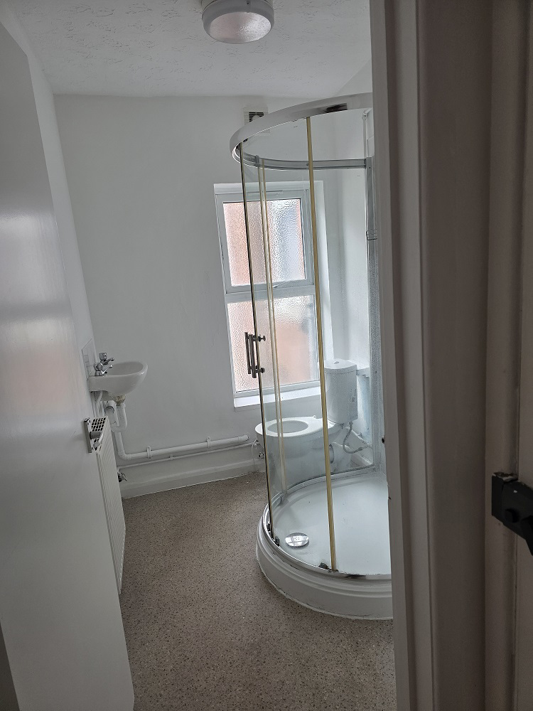Bathroom: Fitted shower, toilet, Lino flooring.