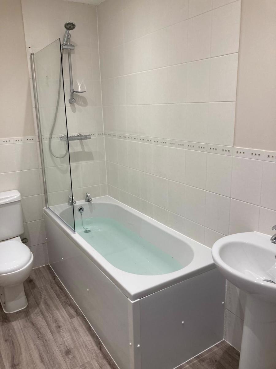 Main bathroom with bath, electric shower over, w.c. wash hand basin